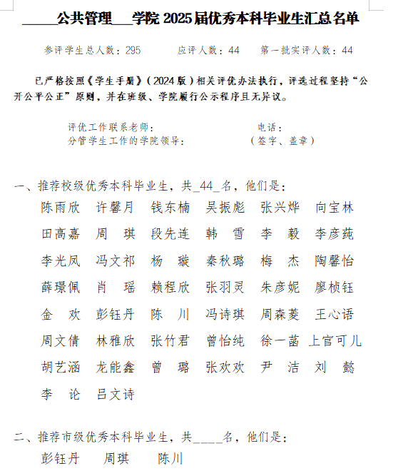当前位置: 首页 >> 学团工作 >> 正文 太阳集团tyc122cc2025届优秀本科毕业生评定公示 时间:2024年12月27日 11:04 作者: 李恒 根据《重庆工商大学优秀毕业生评选办法》相关要求,经学院学生工作领导小组研究,现对2025届优秀本科毕业生评定情况进行公示,公示期为2024.12.27-2024.12.30,公示期间如有异议,请企业微信联系李恒老师或到学院81016办公室进行反映。 附件【附件1:校级、市级优秀本科毕业生汇总名单.doc】已下载次 上一条:太阳集团tyc122cc开展考研复试指导交流会--文科类专场 下一条:互通心声 共话成长——太阳集团tyc122cc 共学社区接待日(第12期) 【关闭】