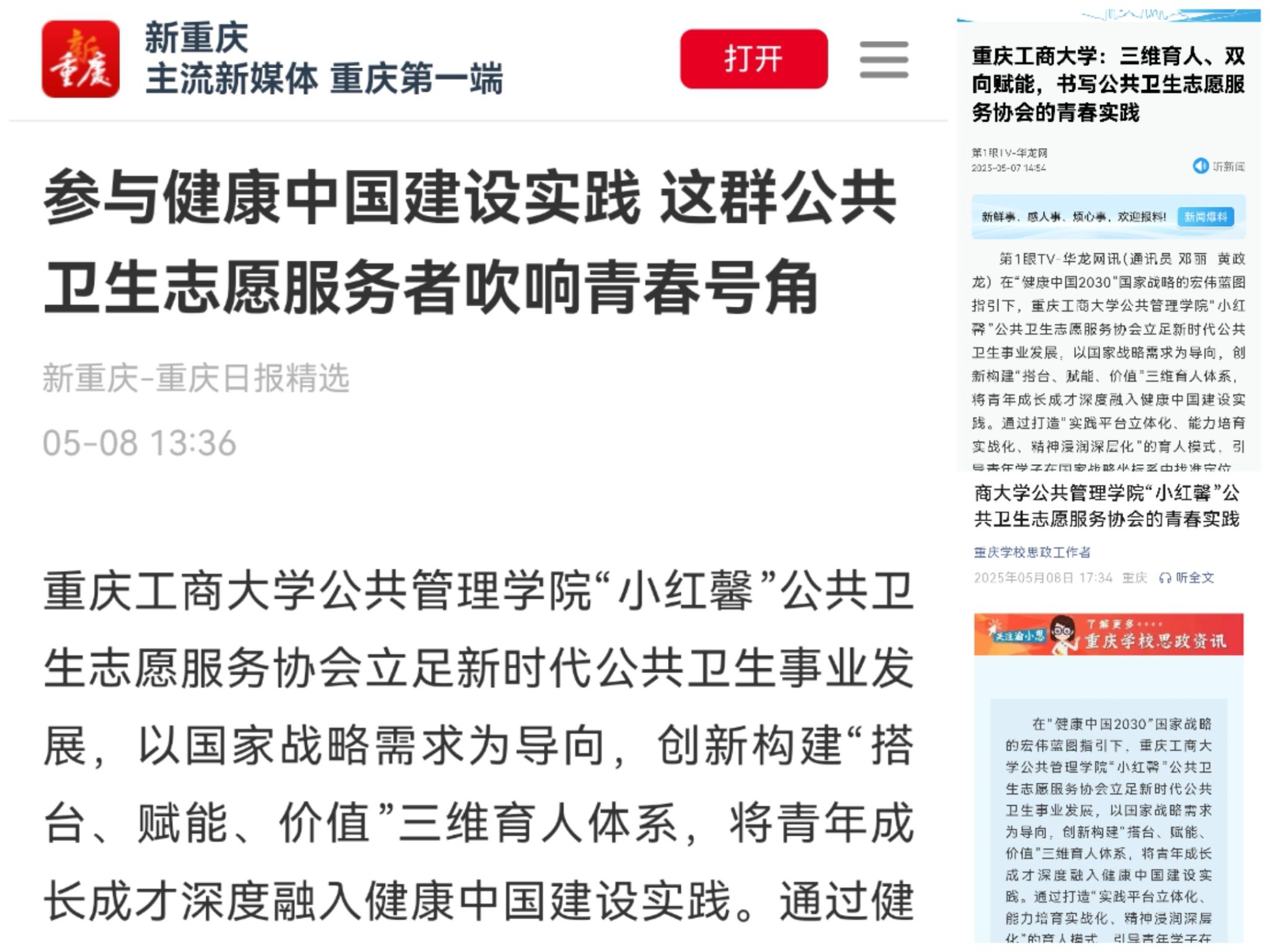 当前位置: 首页 >> 学团工作 >> 正文 新重庆—重庆日报、华龙网等媒体报道我校太阳集团tyc122cc实践育人品牌 时间:2025年05月14日 14:42 作者: 邓丽 在“健康中国2030”国家战略的宏伟蓝图指引下,重庆工商大学太阳集团tyc122cc“小红馨”公共卫生志愿服务协会立足新时代公共卫生事业发展,以国家战略需求为导向,创新构建“搭台、赋能、价值”三维育人体系,将青年成长成才深度融入健康中国建设实践。通过打造“实践平台立体化、能力培育实战化、精神浸润深层化”的育人模式,引导青年学子在国家战略坐标系中找准定位,在服务基层的生动实践中淬炼本领。 近日,新重庆-重庆日报、华龙网、重庆学校思政工作者等主流媒体对此进行了报道。 原文链接: 1.新重庆-重庆日报:《参与健康中国建设实践 这群公共卫生志愿者吹响青春号角》 https://wap.cqrb.cn/xcq/NewsDetail?classId=488&newsId=2267642&staticUrl=https%3A%2F%2Ft.cqrb.cn%2F0Hrg1&RandomTime=1746687318346 2.华龙网:《重庆工商大学:三维育人、双向赋能,书写公共卫生志愿服务协会的青春实践》 https://www.cqnews.net/1/detail/1369688965606694912/web/content_1369688965606694912.html 3.重庆学校思政工作者:《三维育人 双向赋能——重庆工商大学太阳集团tyc122cc“小红馨”公共卫生志愿服务协会的青春实践》 https://mp.weixin.qq.com/s/vxR6v0x09fdZwHiyYMUBWg?mpshare=1&scene=1&srcid=0508IjAvlUms4Ae8y479ydGn&sharer_shareinfo=eb5531fa9f3ea1cc071a21162c4bfae3&sharer_shareinfo_first=eb5531fa9f3ea1cc071a21162c4bfae3&color_scheme=light#rd 上一条:太阳集团tyc122cc2025届毕业生考研奖学金评定公示 下一条:太阳集团tyc122cc举办“读懂中国:发展才是硬道理”主题讲座 【关闭】