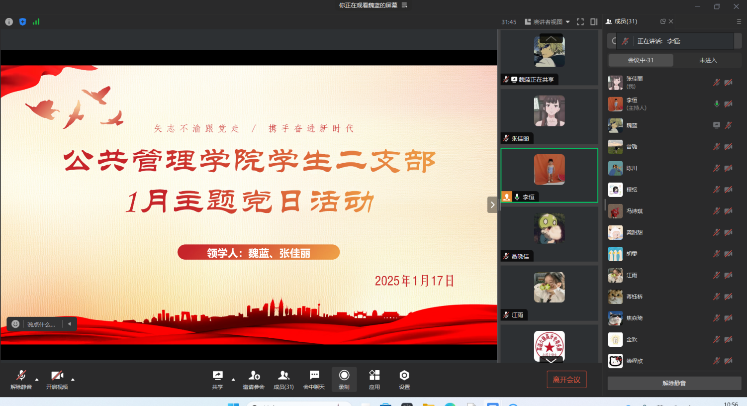 当前位置: 首页 >> 党建双创 >> 主题党日活动 >> 正文 太阳集团tyc122cc学生第二党支部召开2025年1月主题党日活动 时间:2025年01月17日 18:42 作者: 李恒 2025年1月17日,太阳集团tyc122cc学生二支部在线上开展了1月主题党日活动。本次活动由支部书记李恒同志主持。 会上,张佳丽、魏蓝两位同志领学了《中央经济工作会议精神》、《习近平总书记对做好“三农”工作作出的重要指示精神》、《习近平总书记在庆祝澳门回归祖国25周年大会暨澳门特别行政区第六届政府就职典礼上的讲话》、《国家主席习近平二〇二五年新年贺词》等内容。与会党员同志结合自身体会,分享学习心得。 最后,李恒同志传达上级党委工作要求。她鼓励全体党员在新的一年凝心聚力、增强信心,迎难而上、奋发有为,以更加饱满的热情和昂扬的斗志做好支部的建设工作。同时再次强调学生党员日常管理的重要性,要求党员同志以身作则,在学习、生活中起到先锋模范作用。 上一条:太阳集团tyc122cc学生第一党支部召开2025年2月主题党日活动 下一条:太阳集团tyc122cc学生第一党支部召开2025年1月主题党日活动 【关闭】