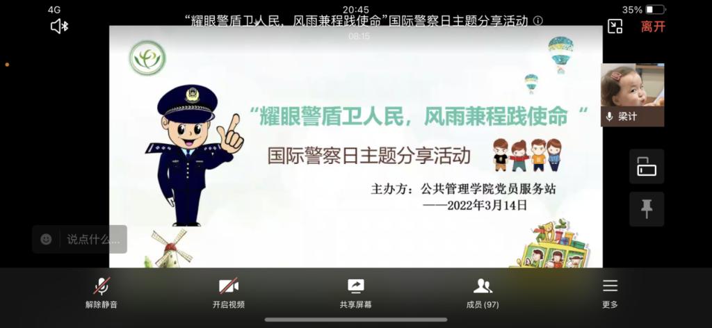 当前位置: 首页 >> 学团工作 >> 学团快讯 >> 正文 【太阳集团tyc122cc党服】“耀眼警盾卫人民,风雨兼程践使命”国际警察日主题分享活动圆满结束 时间:2022年03月15日 17:49 作者: 李恒 2022年3月14日20:45,太阳集团tyc122cc党员服务站由于疫情原因由线下转为线上企业微信活动群开展的“耀眼警盾卫人民,风雨兼程践使命”国际警察日主题分享活动圆满结束,活动通过播放视频与嘉宾分享的形式带领99名入党积极分子及预备党员走进警察的生活。 活动上,首先主持人梁计播放了《黑猫警长》片段引出本次活动的主题,勾起了大家儿时想要成为一名警察的憧憬,并引发大家对于警察这一职业的好奇。紧接着又以一个短片《致敬人民警察》,让同学们了解到警察心中怀揣着的理想与热爱。 其次,由现役于重庆云阳县公安局龙角派出所工作的民警——操骐名同学给大家带来分享:《阿sir的一天》。操骐名同学的分享为大家揭开了警察这一职业的神秘面纱,让大家走进他们的日常生活,了解他们的工作,了解他们的故事。在操骐名同学分享他成为警察的这条路上的辛苦、欣喜和热爱的同时,也让同学们感受到了像人民警察这样总是将国家、社会和他人的利益放在最前面,而甘愿牺牲,甘愿辛苦的可爱的人们的无私和伟大。 最后,活动播放了警务纪实观察类真人秀《守护解放西》中的一个片段,让大家感受警察实际办理案件的过程,更加了解警察的日常生活,感受到警察对我们的守护。在活动结束后同学们发表的心得体会中,也纷纷表示通过活动了解到警察这一职业的辛苦和荣光,并表示对他们深深的敬佩和感恩。从来就没有什么岁月静好,是有人在替我们负重前行。任重,知行,致敬! 上一条:“以青春之我、创造青春之美好未来”----太阳集团tyc122cc青马工程培训会 下一条:【太阳集团tyc122cc党服】 “镌刻拼搏印记,绽放青春风采”冬季奥运会主题手抄报制作活动闭幕式圆满结束 【关闭】
