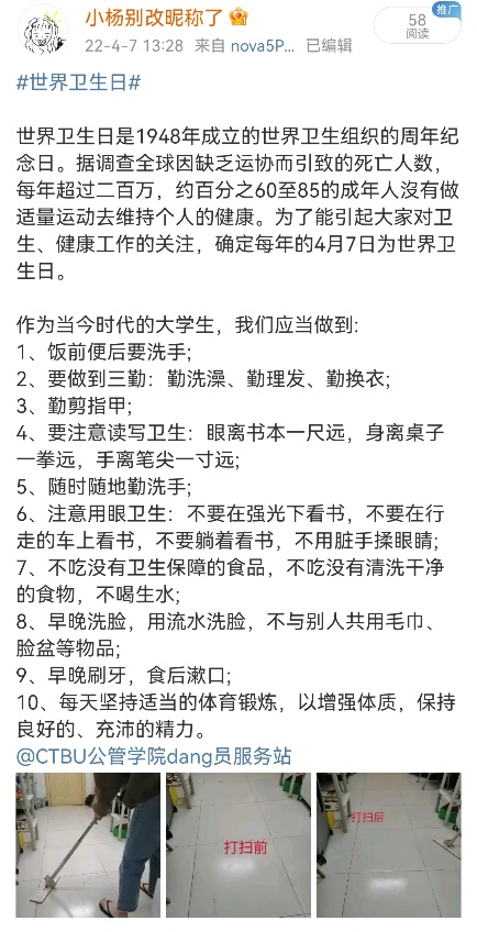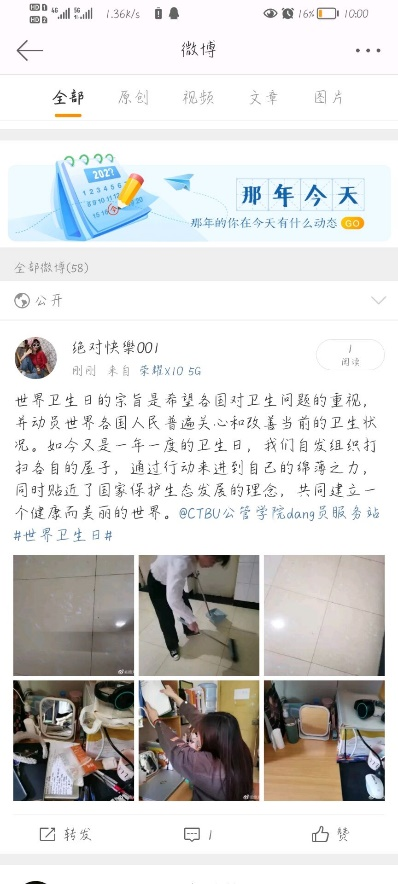 当前位置: 首页 >> 学团工作 >> 学团快讯 >> 正文 【太阳集团tyc122cc党服】“共同洒扫屋朗房清,齐手打造卫生校园”世界卫生日主题打卡活动成功举办 时间:2022年04月11日 16:04 作者: 李恒 2022年4月9日,重庆工商大学太阳集团tyc122cc党员服务站于官方微博平台(CTBU公管学院dang员服务站)开展的“共同洒扫屋朗房清,齐手打造卫生校园”世界卫生日主题打卡活动成功举办。本次活动极大的提升了同学们保持清洁卫生的观念,并强化了卫生习惯,起到了良好的宣传和教育效果。 本次活动以“共同洒扫屋朗房清,齐手打造卫生校园”为活动主题,紧密围绕世界卫生日健康卫生主题,组织同学们对寝室进行打扫,通过图文形式上传打扫记录,并在微博发表相关博文。活动过程中,同学们认真打扫寝室卫生,并通过本次活动,对平时忽视的卫生问题重新给予关注,充分认识到了整洁美丽的卫生环境对生活的重要性。与此同时,有的同学更在劳动中找到了内心的宁静,认为通过自己的切身劳动将寝室的卫生打扫干净,整洁的环境使得整个人都放松下了下来。 世界卫生日确定的宗旨是希望引起世界各国对卫生问题的重视,并动员世界各国人民普遍关心和改善当前的卫生状况。当今时代,大多数人在生活中都很少再进行细致的卫生打扫,这样并不利于健康水平的提高。因此,作为新时代大学生,不仅要讲卫生、爱清洁,更要做美丽环境的守护者,身体力行,争做保卫环境的模范人! 上一条:学院举办《如何认识情绪并自我调适》心理健康讲座 下一条:“以青春之我、创造青春之美好未来”----太阳集团tyc122cc青马工程培训会 【关闭】