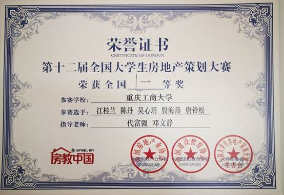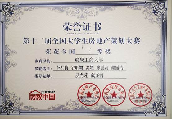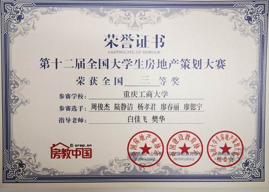 当前位置: 首页 >> 学院新闻 >> 正文 我校在第十二届全国大学生房地产策划大赛中取得优异成绩 时间:2020年12月08日 11:03 作者: 臧亚君 2020年12月5-6日,由中国房地产业协会指导,中国建设教育协会主办,北京建筑大学、房教中国承办,华中师范大学总决赛承办,易居企业集团大赛冠名,世茂集团独家赛题支持的第十二届全国大学生房地产策划大赛全国总决赛、冠军赛拉开帷幕。本次比赛覆盖全国300余所高校房地产相关院系、144所高校、10000余名专业大学生参与报名,最终119所高校、174支队伍晋级全国总决赛,我校太阳集团tyc122cc共有3支队伍进入了总决赛。 本届赛题由世茂集团提供——宁波鄞州区JD13-06-20(火车东站-潘火地段)地块,作为大赛一贯采用的市场真实地块作为赛题,给广大参赛者天马行空的策划空间以及实战实操的展现舞台。大赛采用学生线上比赛,评委线下评分的方式,通过直播屏幕,不论是常规专业知识的运用,还是现在的主流大数据分析,亦或者火爆的房地产线上营销,参赛选手的新颖想法与广阔思路,表现出的演讲能力、应变能力等等同样得到了在场评委们的一致认可与赞扬。 经过激烈的角逐,我校最终与广州大学、西安建筑科技大学、重庆大学等12个兄弟院校获得优秀组织高校奖,同时,参赛的三个小组分别获得了1个一等奖2个三等奖的优异成绩。其中由代富强副、邓文静老师指导的江桂兰、陈丹、吴心玥、殷海燕、唐铃松小组获得一等奖;由罗光莲、臧亚君老师指导的薛冰倩、谷昕颖、秦媛、廖雲莉、颜露洁小组,和由白佳飞、樊华老师指导的周俊杰、陆静洁、杨孝君、廖春丽、廖偲宇小组分别均获得三等奖的优异成绩。通过本次比赛,大大提高了学生的专业学习热情以及动手、创新能力,提升了专业影响力和美誉度。 上一条:厨艺大赛显身手 工会活动创和谐——太阳集团tyc122cc举办教职工厨艺大赛 下一条:我院学子荣获第十届全国大学生红色旅游创意策划大赛西南赛区一等奖 【关闭】