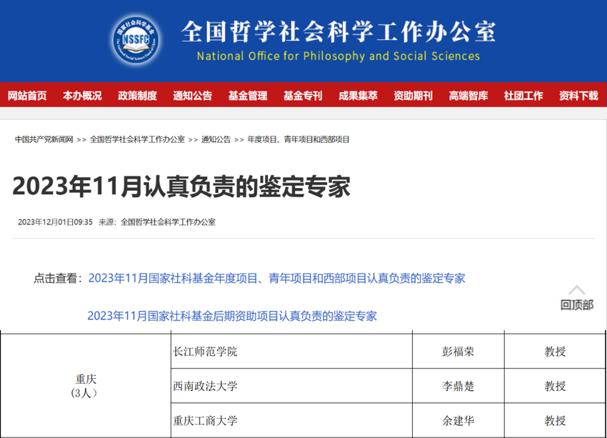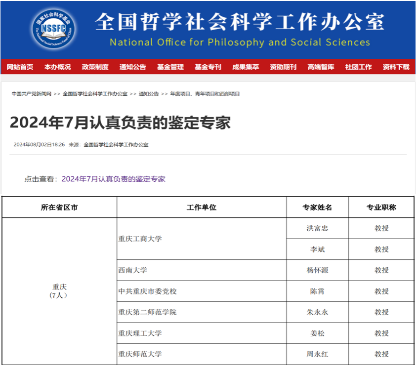当前位置: 首页 >> 科学研究 >> 正文 我院多位教师获评国家社科基金 “认真负责的鉴定专家” 时间:2024年09月06日 16:31 作者: 近日,全国哲学社会科学工作办公室公布了2024年8月国家社科基金项目“认真负责的鉴定专家”名单,我院李斌教授名列其中。这是继李斌教授今年7月获得全国哲学社会科学工作办公室“认真负责的鉴定专家”之后,再次登上荣誉榜。除李斌教授外,去年11月,我院余建华教授也曾获此殊荣。 据悉,为切实提高国家哲学社会科学研究成果的水平和质量,保证鉴定工作的客观性、公正性和公平性,全国哲学社会科学规划办公室对结项工作采取通讯评议制度。承担结题成果鉴定的专家应当按照要求履行鉴定职责,其中鉴定态度非常认真负责、评价意见客观中肯、写出高水平鉴定意见的专家将被记入全国哲学社会科学规划办公室“成果鉴定工作认真负责的专家档案”。 近年来,我院多位教师承担并认真完成全国哲学社会科学工作办公室委托的多项课题鉴定和评审等工作,工作成效显著。该荣誉反映了全国哲学社会科学工作办公室对我院评审专家良好专业素养、严谨治学态度和学术评价水平的肯定,在一定程度上进一步提高了我院哲学社会科学研究的学术影响力和科研知名度。 上一条:学院两名教师入选重庆市学术技术带头人 下一条:人口发展与政策研究中心教师谭江蓉、强国民参加中国人口学会2024年年会 【关闭】