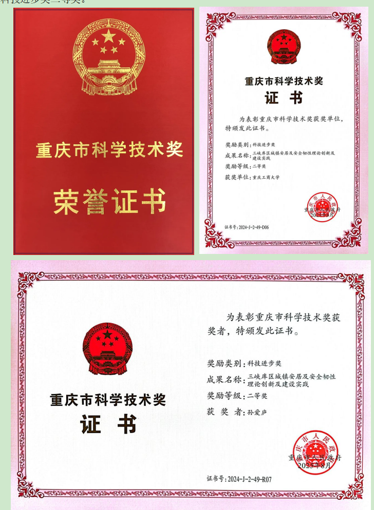 当前位置: 首页 >> 科学研究 >> 科研成果 >> 正文 我院城乡规划学科专业教师参与项目获得2024年度重庆市科技进步奖二等奖1项 时间:2025年09月09日 15:46 作者: 2025年8月28日,重庆市科技创新大会隆重举行。我院城乡规划学科专业教师孙爱庐博士参与的“三峡库区城镇安居及安全韧性理论创新及建设实践”项目荣获重庆市科技进步奖二等奖。 该项目以重庆城市科技学院作为第一完成单位,以重庆城市科技学院建筑与土木工程学院赵万民院长为第一完成人,联合重庆大学、重庆市万州区规划和自然资源局、 重庆师范大学、重庆市设计院有限公司、重庆工商大学等单位研究人员,开展关键技术联合攻关与实践应用。 项目针对三峡工程后期库区城镇面临的移民居住环境改善、生态安全与地质灾害防治等现实问题,以吴良镛院士“人居环境科学理论”为基础,结合三峡实际,开展了长达20年的系统研究,构建了山地城镇空间格局优化与移民住区品质提升的理论体系,从“时间-空间-人文”多重维度建立规划控制和预警方法,为移民安居提供理论支撑;提出了防灾减灾与生态基础设施耦合建设的理论和技术模型,融合景观生态学与山地城镇建设特点,形成系统性应对地质灾害的创新方法;科学理论在万州区、长寿区开展成功实践,有效解决了城镇土地规划与人居环境建设中的多项难题,成为可推广的典型案例。 我院城乡规划学科专业将以此为契机,进一步整合学术资源,推动与兄弟单位的持续合作,深化产学研协同创新,持续推动科研成果转化与应用;同时,积极响应国家战略与成渝地区双城经济圈发展需求,为城乡高质量发展提供更有力的技术支撑和决策参考。 上一条:我院毕国华老师连续入选公共管理学科“全国高被引学者Top1%”榜单 下一条:我院成功获批1项国家卫健委2025年人口高质量发展研究揭榜攻关项目 【关闭】