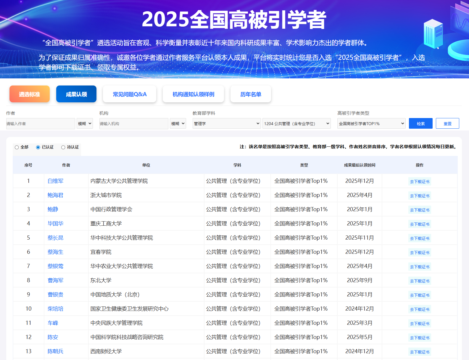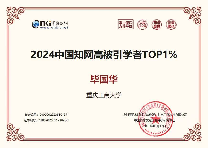 当前位置: 首页 >> 科学研究 >> 科研成果 >> 正文 我院毕国华老师连续入选公共管理学科“全国高被引学者Top1%”榜单 时间:2025年12月22日 08:30 作者: 近日,作为全球最大的中文文献数据库和知识服务平台之一,中国知网(中国科学文献计量评价研究中心)发布了“2025年全国高被引学者”名单,我院教师毕国华继2024年入选中国知网中国科学文献计量评价研究中心首次发布的“2024年中国知网高被引学者Top1%”榜单后,今年再次入选该中心发布的“2025年全国高被引学者Top1%”名单。 毕国华系我院土地资源管理系专任教师,长期从事乡村土地利用、乡村空间治理等方面的研究,主持教育部人文社会科学研究项目1项、重庆市社会科学规划项目1项、校级科研项目2 项,参与国家社会科学基金重大项目、国家自然科学基金面上项目等多项国家级、省部级科研项目,以第一作者或通讯作者在《Land Use Policy》《Land》《中国土地科学》《农业工程学报》《经济地理》《生态学报》等国内外权威期刊发表多篇学术论文。此次连续入选“全国高被引学者Top1%”榜单,不仅是对教师个人学术成就的肯定,更是学院科研实力与人才培养成果的有力彰显。学院将持续营造良好的学术氛围,培育更多高水平学术成果,助力学院各项事业高质量发展。 据悉,“高被引学者TOP1%”评选基于学者近十年的学术成果进行综合评估,旨在遴选出各学科领域内具有显著学术引领力的顶尖学者。学者需满足严格的综合标准:近十年内,其发表的论文需持续保持高影响力,所发表成果的PCSI指数总和需位居全国学者前1%;同时,必须至少拥有一篇受到学界重点关注的高影响力代表作,并且累计发表不少于5篇PCSI指数高于1.65的论文,体现了研究成果质与量的双重卓越,含金量极高。 上一条:喜讯|我院两案例入库中国专业学位案例中心公共管理案例库 下一条:我院城乡规划学科专业教师参与项目获得2024年度重庆市科技进步奖二等奖1项 【关闭】