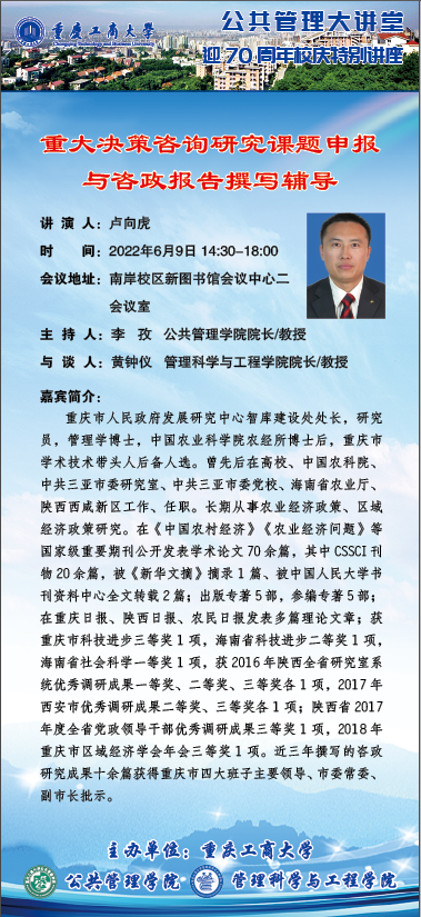 当前位置: 首页 >> 科学研究 >> 学术讲座 >> 正文 公共管理大讲堂(迎70周年校庆特别讲座)——重大决策咨询研究课题申报与咨政报告撰写辅导 时间:2022年06月08日 14:24 作者: 上一条:公共管理大讲堂——延迟法定退休年龄问题的战略与战术思考 下一条:公共管理大讲堂(迎70周年校庆特别讲座)——中国共产党社会保障政策的目标选择及其实践取向 【关闭】