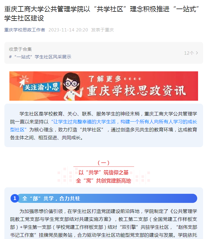 当前位置: 首页 >> 学团工作 >> 共学社区 >> 正文 市教委“重庆学校思政工作者”微信公众号报道我校太阳集团tyc122cc“一站式”社区建设 时间:2023年11月16日 09:55 作者: 刘乂萌 原文链接:重庆工商大学太阳集团tyc122cc以“共学社区”理念积极推进“一站式”学生社区建设 上一条:共学社区 多维育人——太阳集团tyc122cc开展共学社区系列活动 下一条:重庆工商大学太阳集团tyc122cc以“共学社区”理念积极推进“一站式”学生社区建设 【关闭】