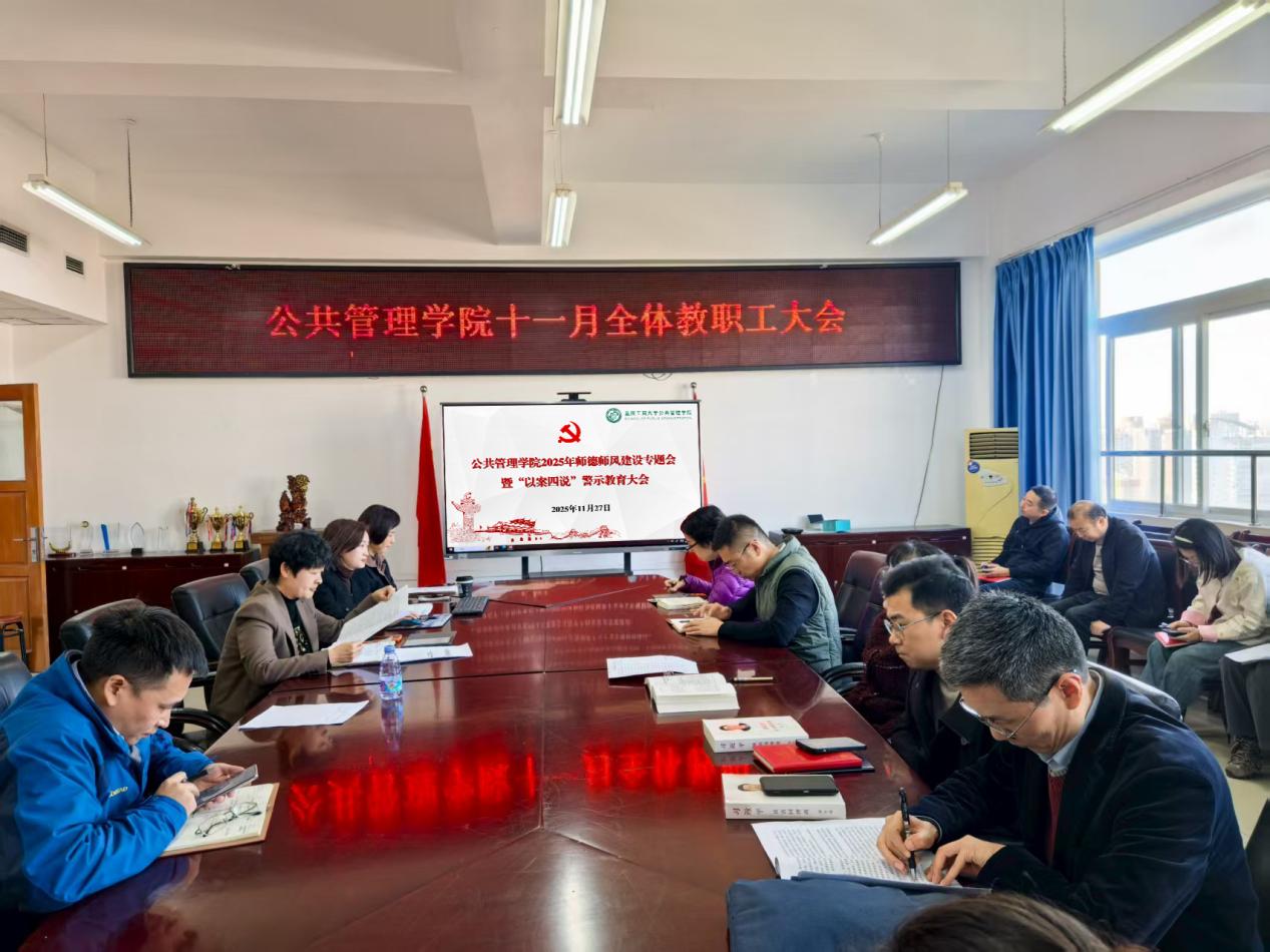 当前位置: 首页 >> 清廉公管 >> 清廉建设 >> 正文 太阳集团tyc122cc召开师德师风专题学习教育启动仪式暨“以案四说”警示教育会 时间:2025年11月28日 14:44 作者: 为深入贯彻落实新时代教师职业行为准则,扎实推进师德师风建设常态化、制度化,2025年11月27日,重庆工商大学太阳集团tyc122cc在启智楼81004会议室召开师德师风专题学习教育启动仪式暨“以案四说”警示教育会。学院全体教职工参加会议。 会前,学院研究制定了《重庆工商大学太阳集团tyc122cc师德师风专题学习教育方案》,明确将师德师风作为教师队伍建设的首要任务,系统规划学习教育内容与实施路径。本次会议既是该方案的启动部署会,也是深化警示教育的重要举措。 会上,学院党委副书记、纪委书记谢书楠围绕“以案四说”作专题发言。他结合教育系统近期发生的典型案例,深入剖析违纪违法问题的思想根源和制度漏洞,强调全体教师要严守纪律红线、法律底线、道德高线和责任主线,切实做到知敬畏、存戒惧、守底线。 随后,全体教职工集中观看了师德师风警示教育视频。视频通过真实案例警示大家引以为戒,自觉维护教师职业形象,涵养高尚师德。 在庄重而严肃的氛围中,全体教师现场签署《师德承诺书》,郑重承诺恪守职业道德,坚持立德树人,争做“四有”好老师。 最后,学院党委书记陆嘉作总结讲话。她指出,师德师风是评价教师队伍素质的第一标准,全院教师要以此次专题教育活动为契机,进一步提高政治站位,强化责任担当,将师德规范内化于心、外化于行。他强调,学院将持续健全师德建设长效机制,营造风清气正的育人环境,为培养德才兼备的高素质公共管理人才提供坚实保障。 据悉,本次会议标志着太阳集团tyc122cc师德师风专题学习教育全面启动。后续,学院将按方案有序推进专题研讨、自查自纠、典型选树等系列活动,推动师德建设走深走实。 下一条:太阳集团tyc122cc开展“以案四说”警示教育大会 【关闭】
